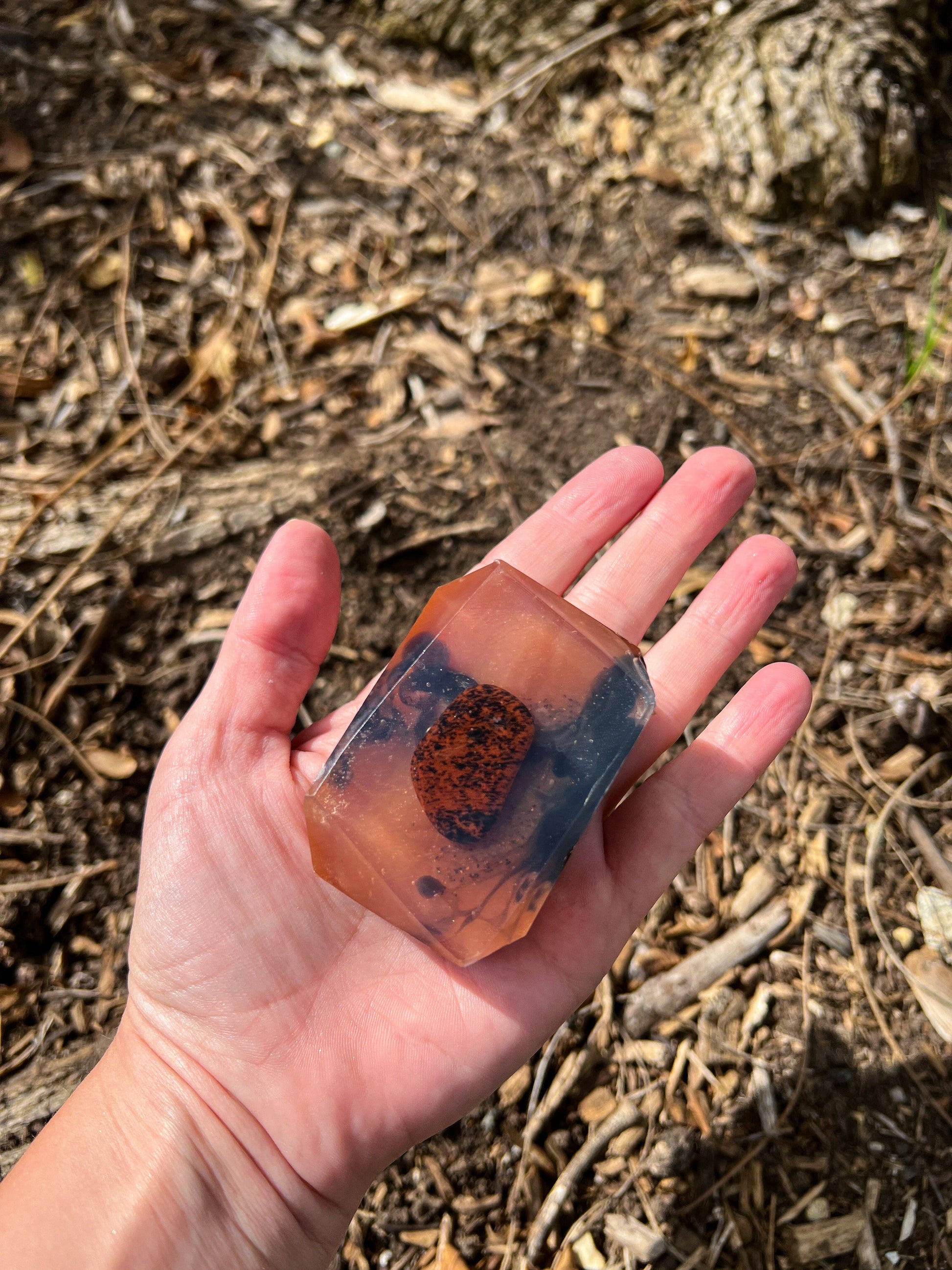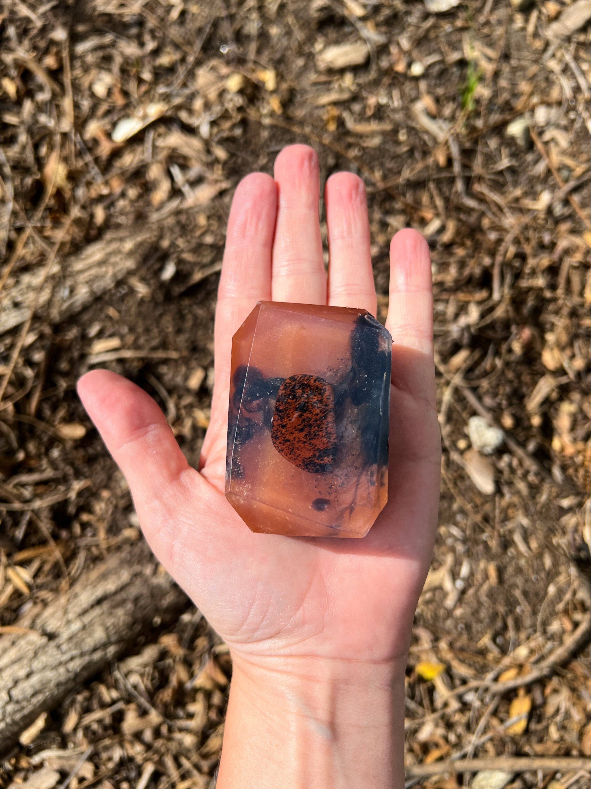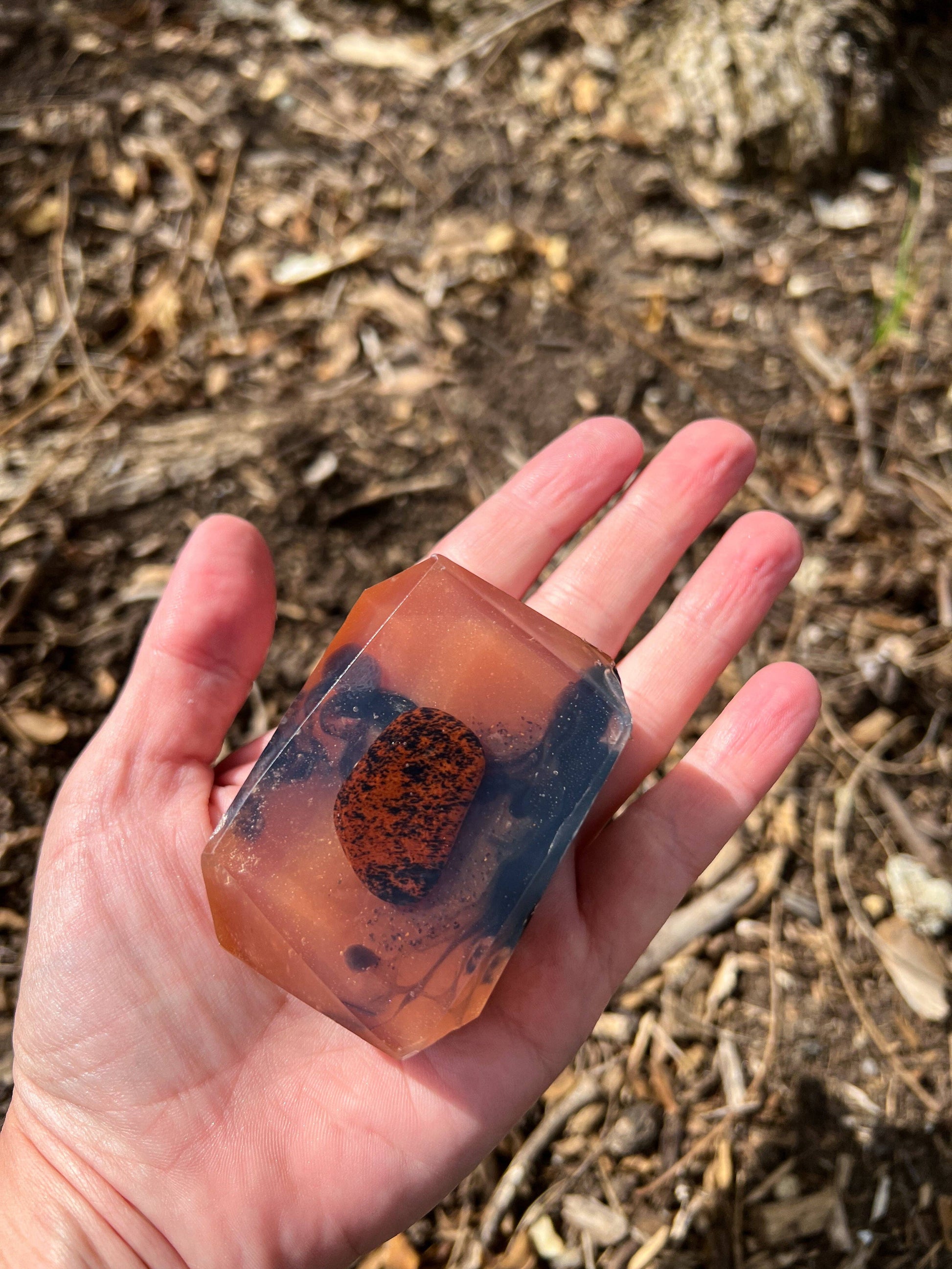 This vegan and handmade bar is crafted with the grounding crystal Mahogany Obsidian, known as the "Stone of Strength and Protection." Revered for its deep connection to the Earth, Mahogany Obsidian fosters stability and balance, helping to shield against negativity while empowering personal growth. It is a stone of courage, guiding you through transformation and reminding you of your inherent strength.